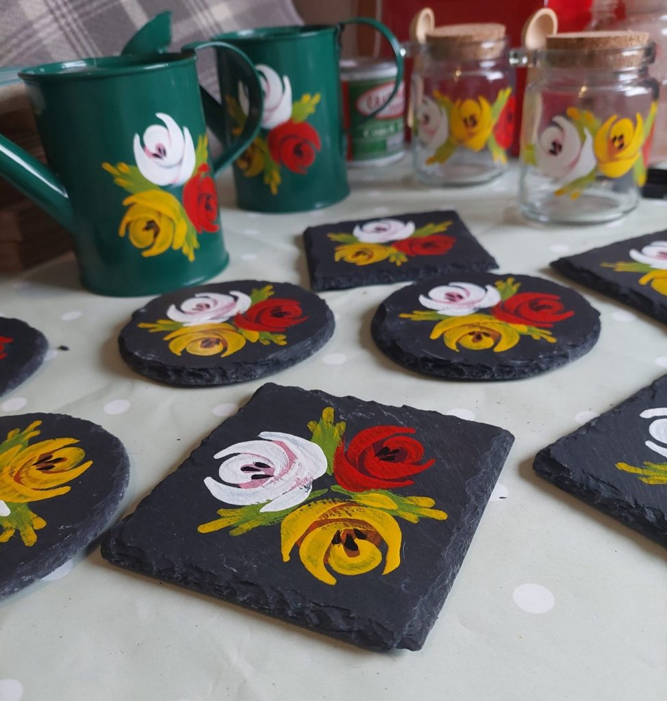 Using canal art inspired techniques to paint and upcycle unwanted items, to give a new purpose and share as handcrafted gifts for any home… or boat.