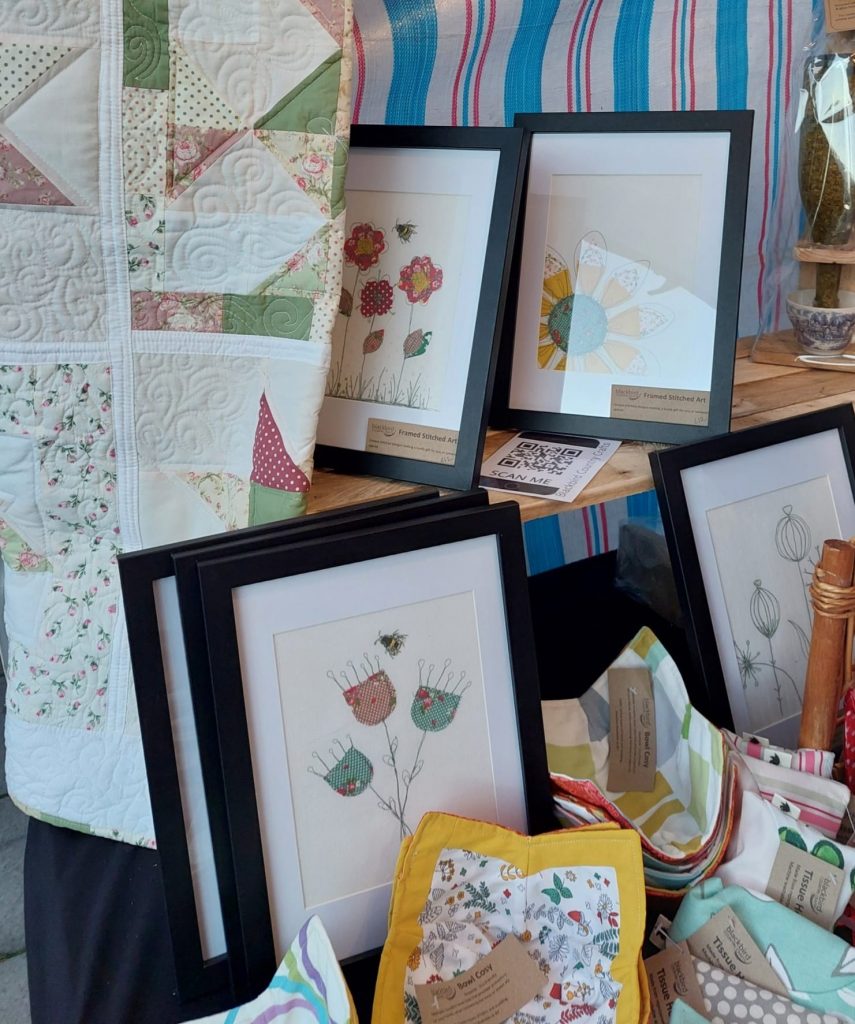 A variety of bespoke and handcrafted wall art using recycled fabrics and frames.